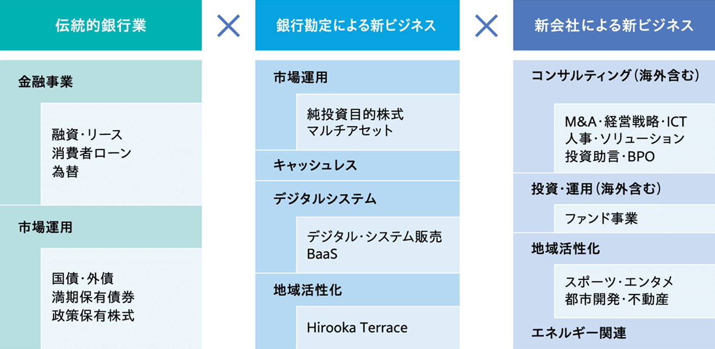 20年後の持続可能な持株会社体制に向けて、地域でのファイナンス事業に加え、新たな事業領域を拡大