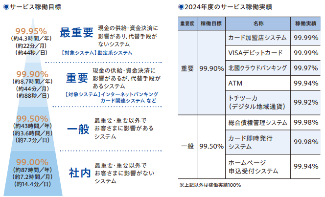 当社が考えるサービスの重要性を基準とした「稼働目標」と年間の「稼働実績」を2021年度分から公開 しています。2024年度は、すべてのサービスにおいて稼働実績が稼働目標を上回る結果となりました。 引き続き、サービスの稼働実績やシステム障害情報を積極的に発信し、改善策を講じることで、サービ スの品質向上につなげていきます。