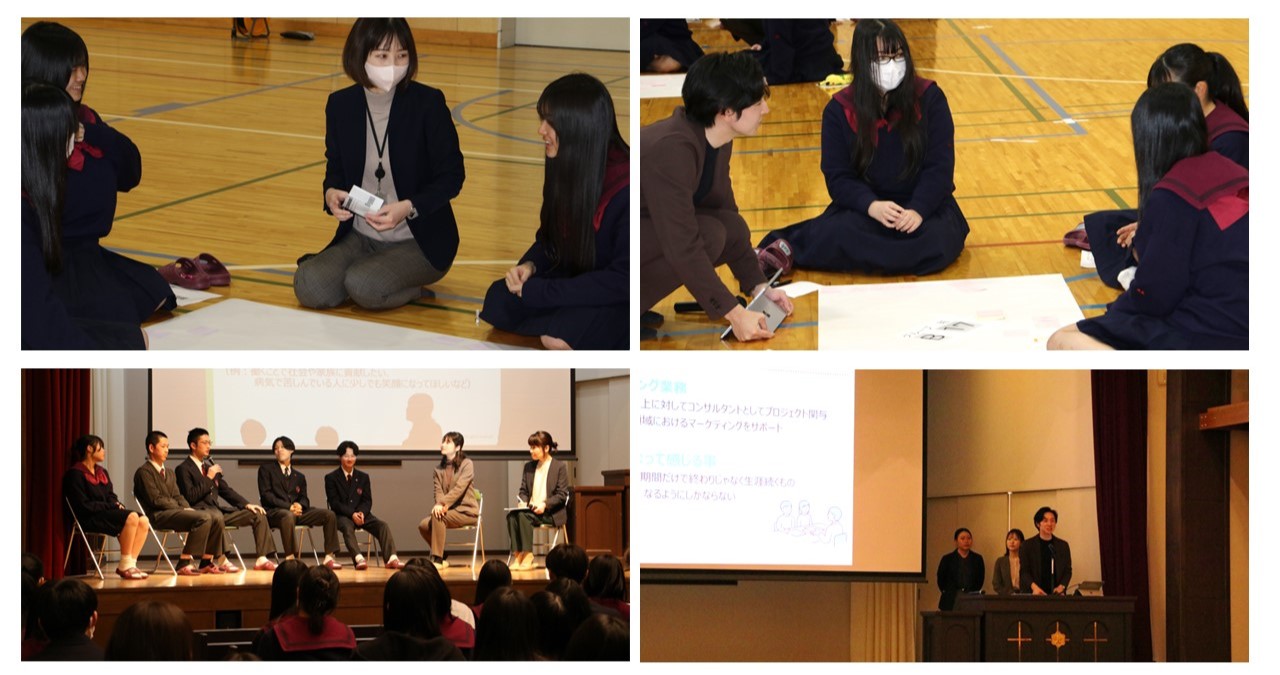 講話では、講師からキャリアについてお伝えし、生徒の代表者の方とのディスカッションを実施しました。「お金を使って、社会に貢献したい」「安定を基準に職業を選択したい」など、自分が描いているキャリアを発表していただきました。講師からは、「キャリアは様々だから決めつけなくてよい、自分の価値観を大切にしてほしい」とお伝えしました。