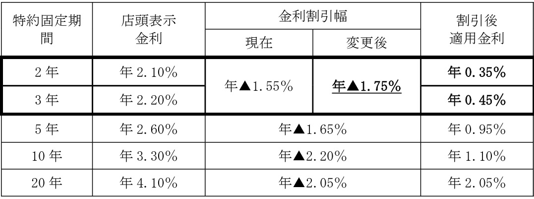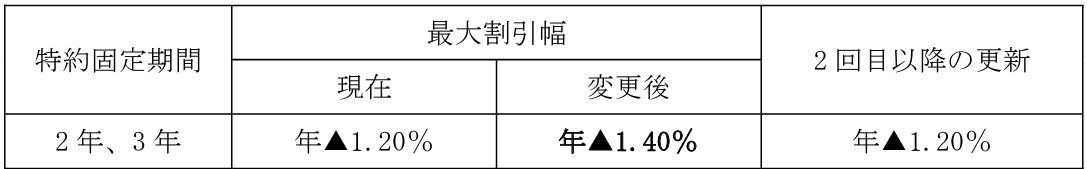 住宅ローンを3月22日以降新規でお借入される際に、特約固定2年、3年を選択されるお客さまのお借入時および初回金利更新時の割引幅を拡大します。