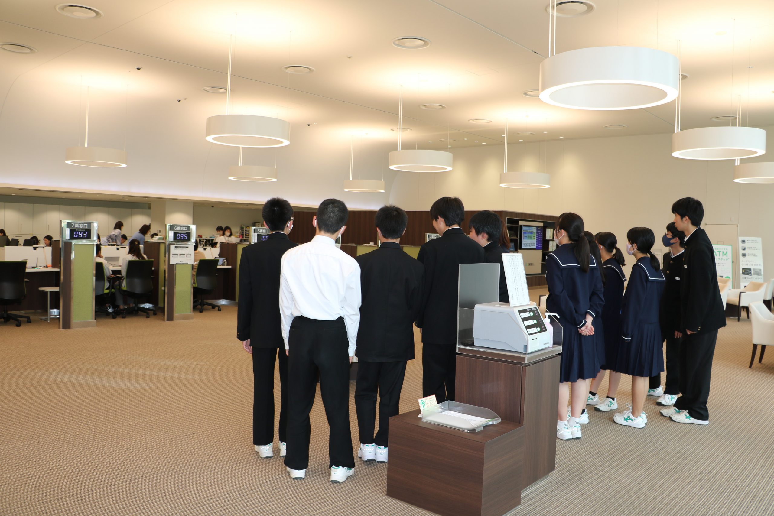 講話では、キャリアやライフプランについてお話ししました。生徒の皆さんからは「お金のことについて勉強になったし、今後ももっと知っていきたい」というお声をいただきました。見学では、本店の広さやセキュリティに対して驚きの声が上がっていました。
