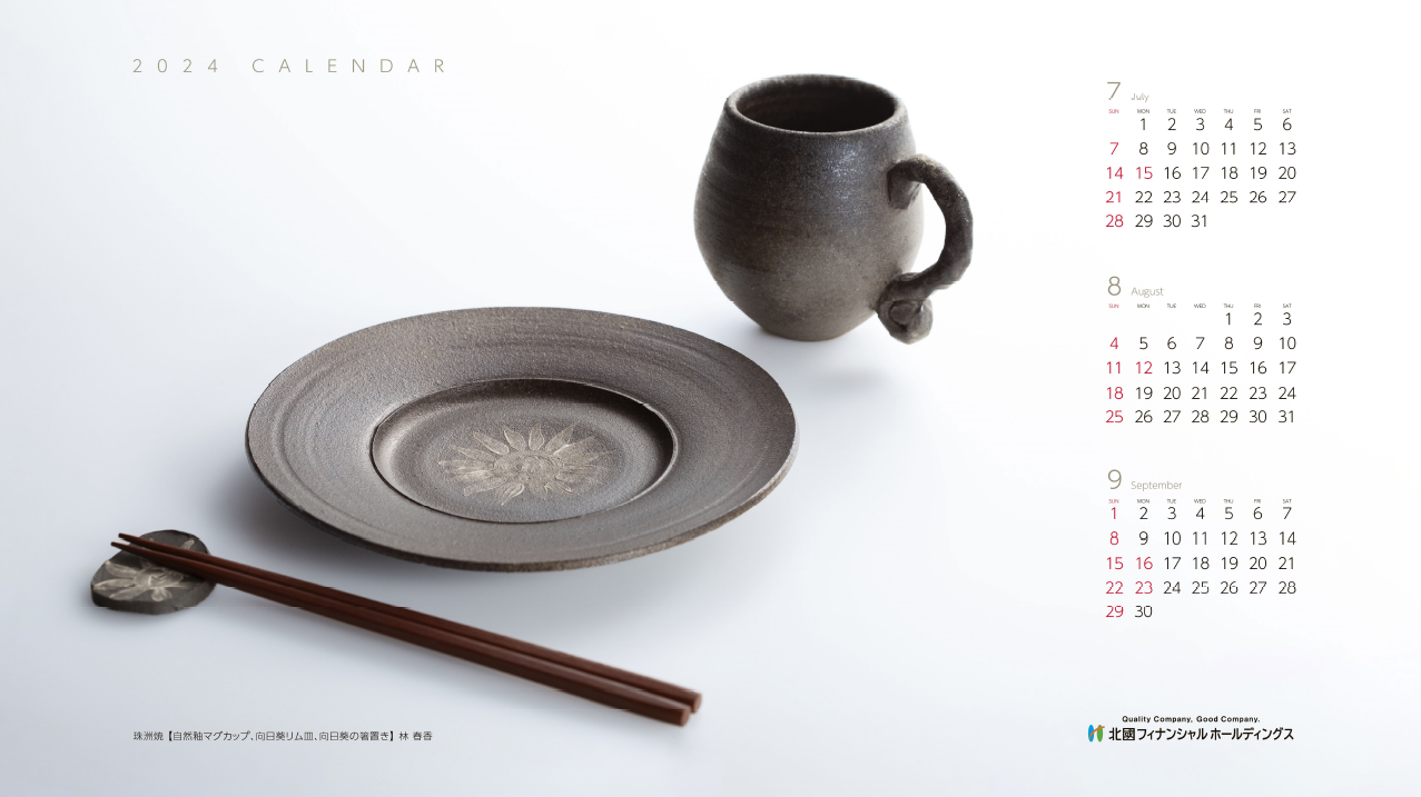 夏版(7月~9月)は珠洲焼作家である林春香氏の「自然釉マグカップ、向日葵リム皿、向日葵の箸置き」を掲載いたします。電子版カレンダーは、北國銀行のホームページよりどなたでもダウンロード可能となっております。パソコンやタブレット端末・スマートフォンの待受画像としてもご利用いただけます。2024年10月には、秋版(10月~12月)の電子カレンダーもリリース予定です。