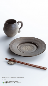 作品名 珠洲焼「自然釉マグカップ、向日葵リム皿、向日葵の箸置き」