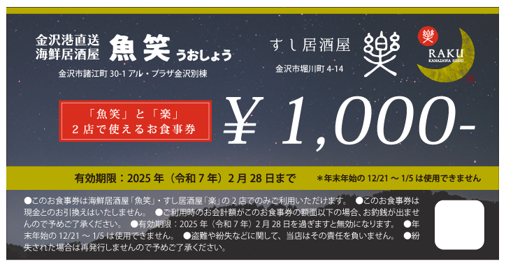 新店舗「すし居酒屋 楽(らく)」でのご利用はもちろん、アル・プラザ金沢内に店を構える姉妹店「魚笑」でもご利用いただけます。