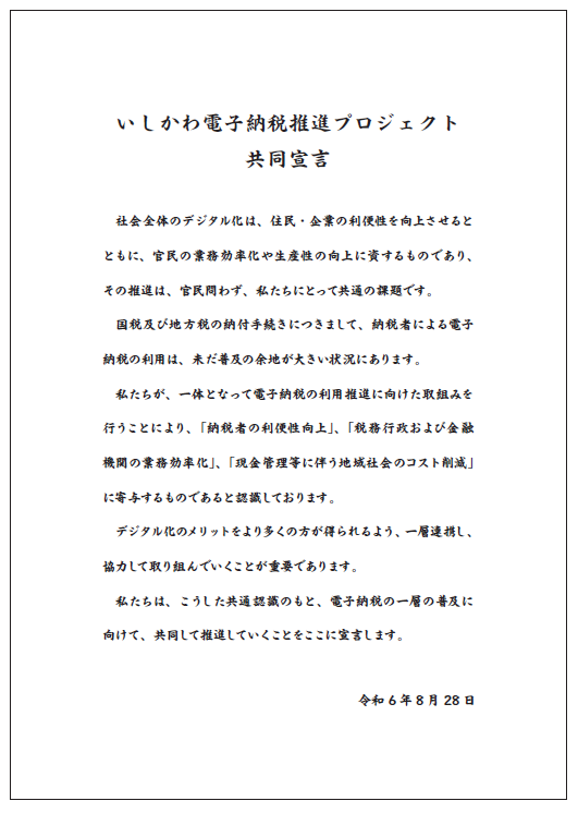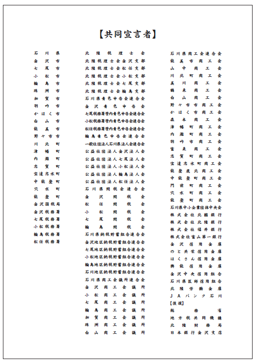 | 共同宣言者 | 【行政機関】(26団体) 石川県及び県内各市町、金沢国税局及び各税務署 【金融機関】(12団体) 石川県内に本店のある金融機関及び、北陸銀行、福井銀行、富山第一銀行 【各種団体】(59団体) 石川県内の税理士会、法人会、間税会、青色申告会、納税貯蓄組合 商工会議所、商工会、及び石川県中小企業団体中央会 |