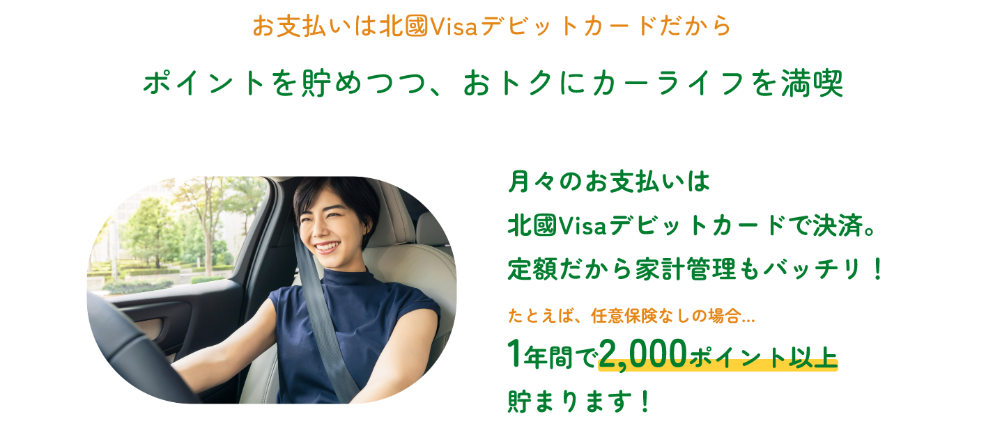 毎月のリース料を北國Visaデビットカードでお支払いいただくことで、1年間で2,000ポイント以上を貯めることができます。また、支払い額が一定のため計画的な家計管理ができます。