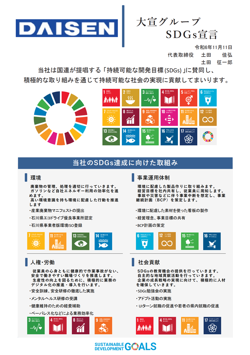 今般、大宣グループ(株式会社大宣看板 代表取締役:土田 佳弘、株式会社大宣道路 代表取締役:土田 征一郎)が当社コンサルティングを通じて「SDGs宣言」を策定されましたので、下記のとおりお知らせいたします。