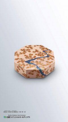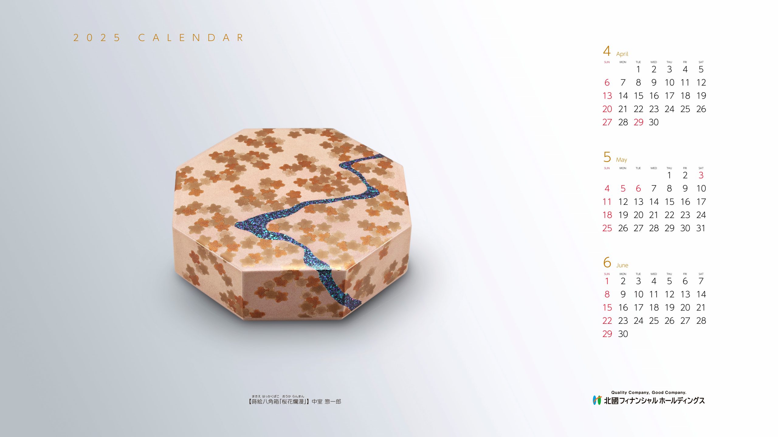 春版(4月~6月)は漆芸作家である中室 惣一郎氏の「蒔絵八角箱『桜花爛漫』(まきえはっかくばこ『おうからんまん』)」を掲載いたします。電子版カレンダーは、北國銀行のホームページよりどなたでもダウンロード可能となっております。パソコンやタブレット端末・スマートフォンの待受画像としてもご利用いただけます。