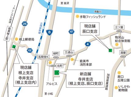- 移転に伴い根上支店及び辰口支店は寺井支店の支店内支店として営業いたします。