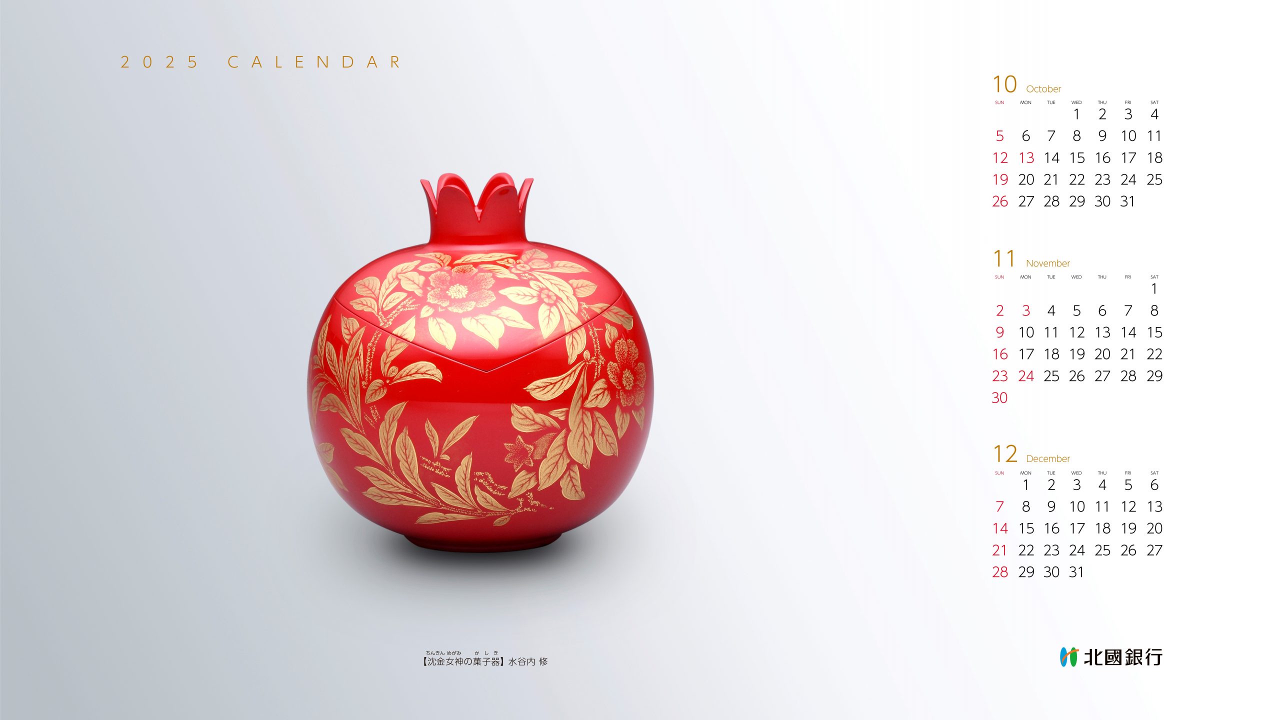 秋版(10月~12月)は漆芸作家である水谷内 修氏の「沈金女神の菓子器」を掲載いたします。電子版カレンダーは、北國銀行のホームページよりどなたでもダウンロード可能となっております。パソコンやタブレット端末・スマートフォンの待受画像としてもご利用いただけます。