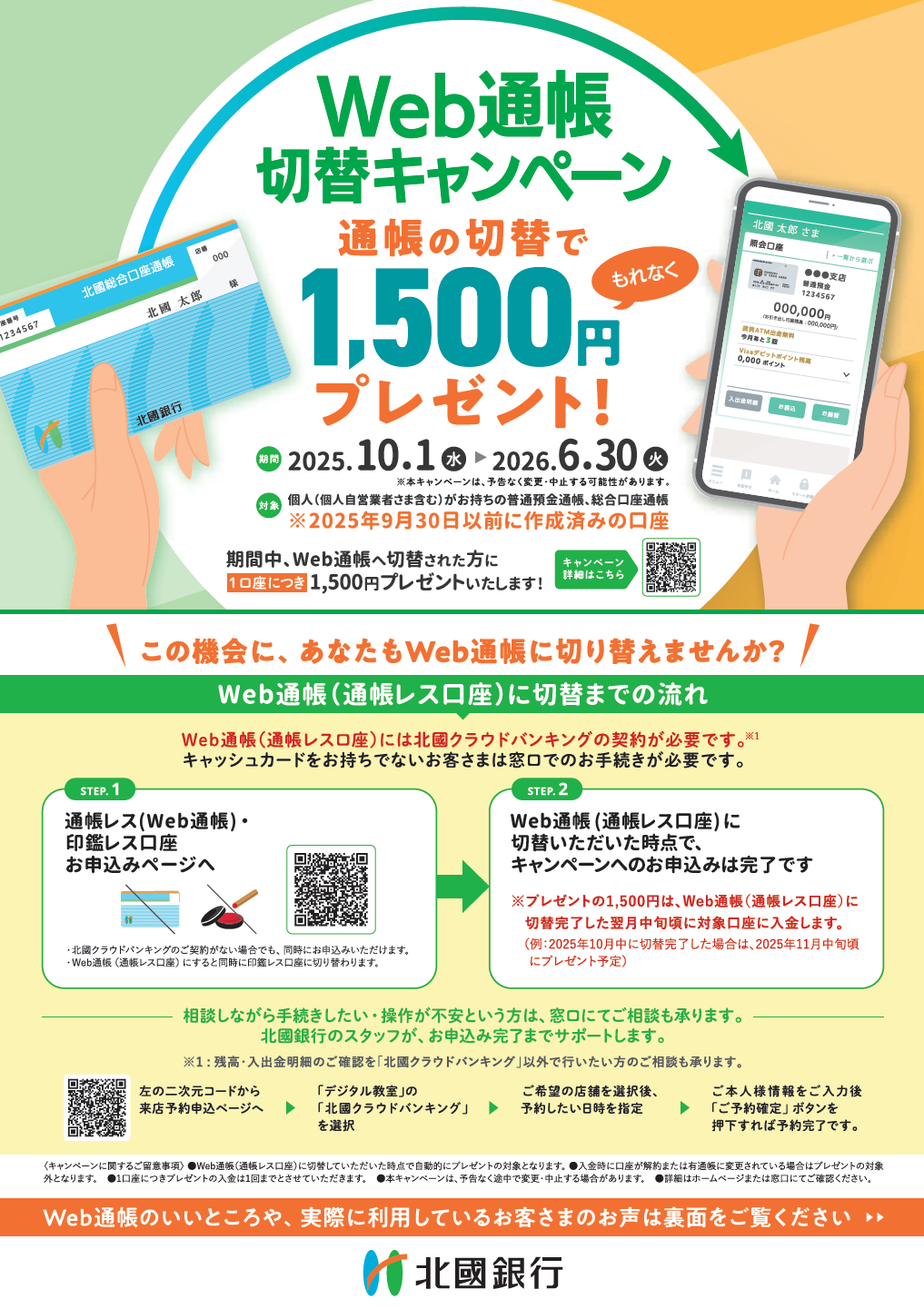 合わせて、2025年10月1日より「Web通帳切替キャンペーン」を実施いたします。本キャンペーンでは弊社普通預金口座通帳、総合口座通帳をお持ちで、期間内に当該通帳をWeb通帳へ切替を行った個人のお客さまに対し、もれなく現金1,500円をお口座にご入金いたします。