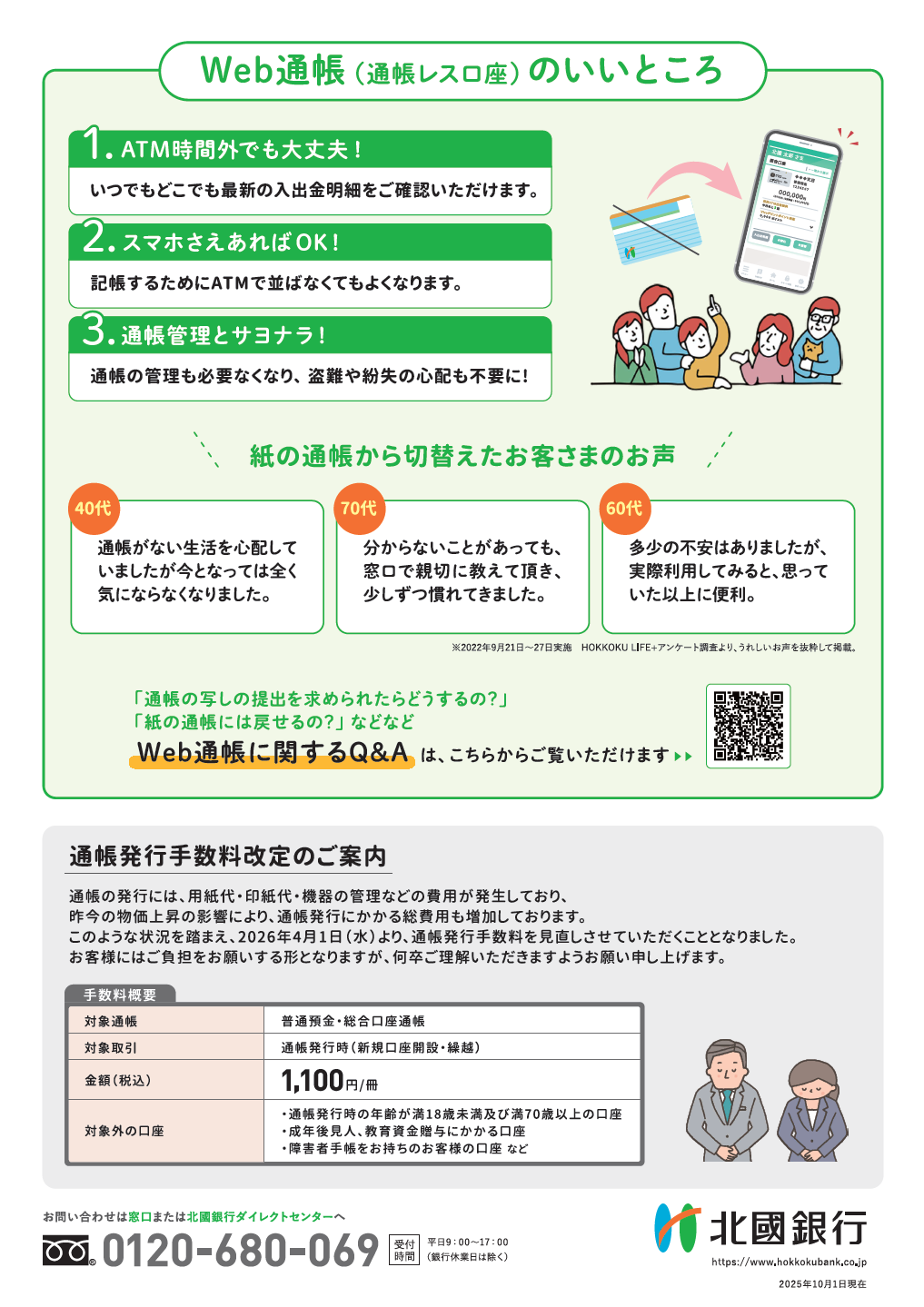 株式会社北國銀行(代表取締役社長:米谷 治彦)は、2026年4月1日(水)より、通帳発行手数料を改定することといたしましたので、お知らせいたします。