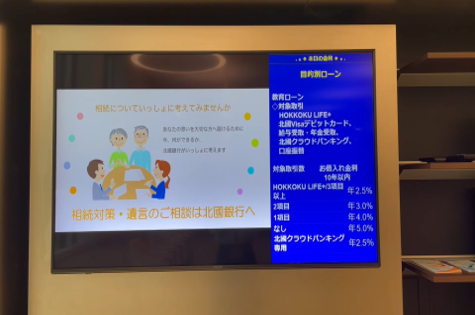 北國銀行店舗内に設置しているディスプレイに掲出します。音ありで視覚と聴覚の相乗効果で記憶に残りやすく、待合室での待ち時間にじっくりご覧いただけます。
