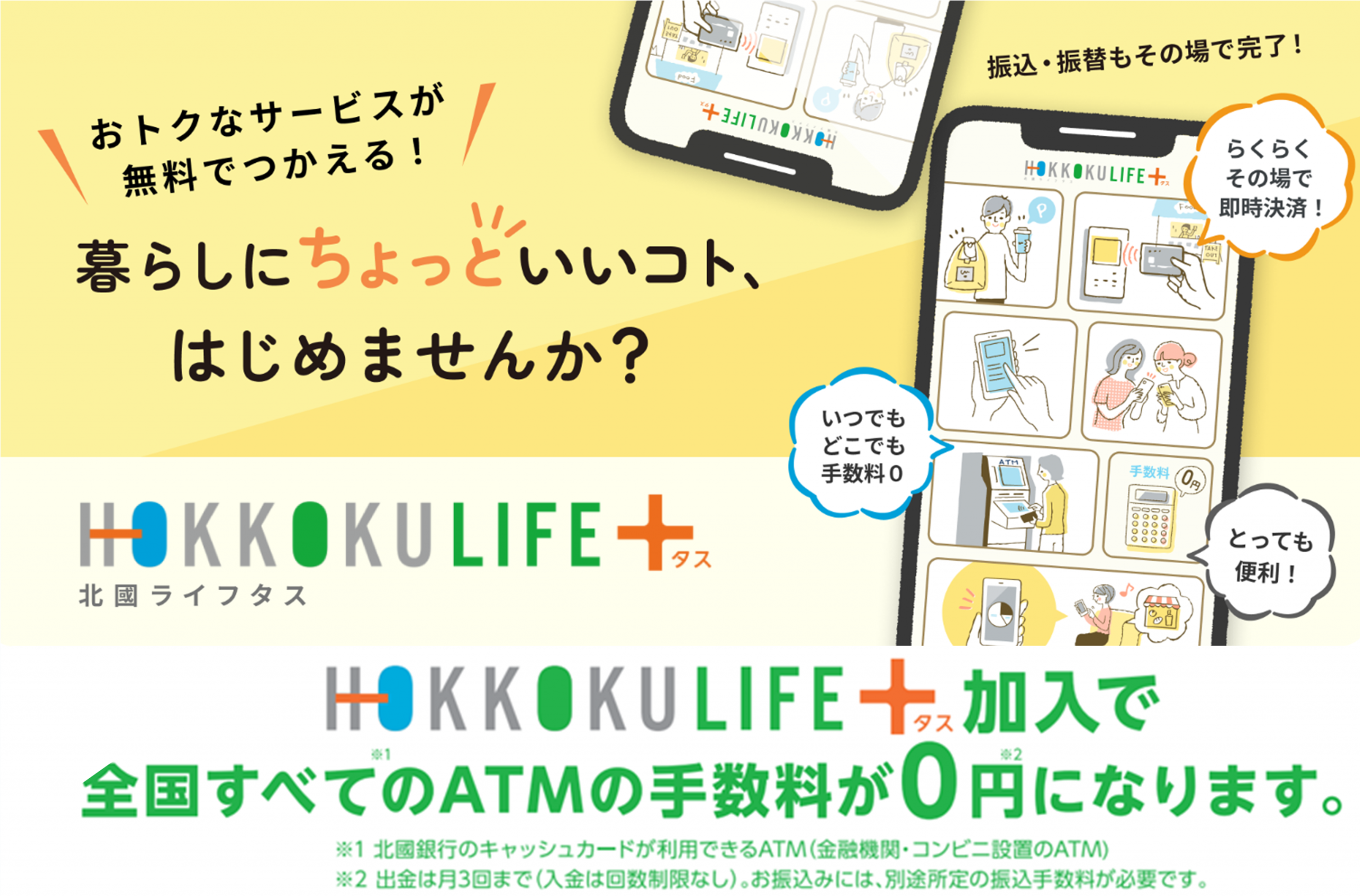 「HOKKOKU LIFE+」はVisa デビットカード、北國クラウドバンキングと通帳レス(Web通帳)・印鑑レスの預金口座がセットになったサービスです。特典として全国ほぼすべてのATMが手数料無料で利用可能であり、北國銀行の支店やATMがない場所でも便利にお使いいただけます。上記に加え、北國クラウドバンキングでは他金融機関を含む振込も無料でご利用いただけます。