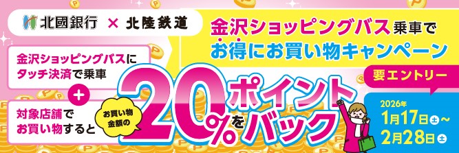 | 名称 | 【北國銀行×北陸鉄道】 金沢ショッピングバス乗車でお得にお買い物キャンペーン |