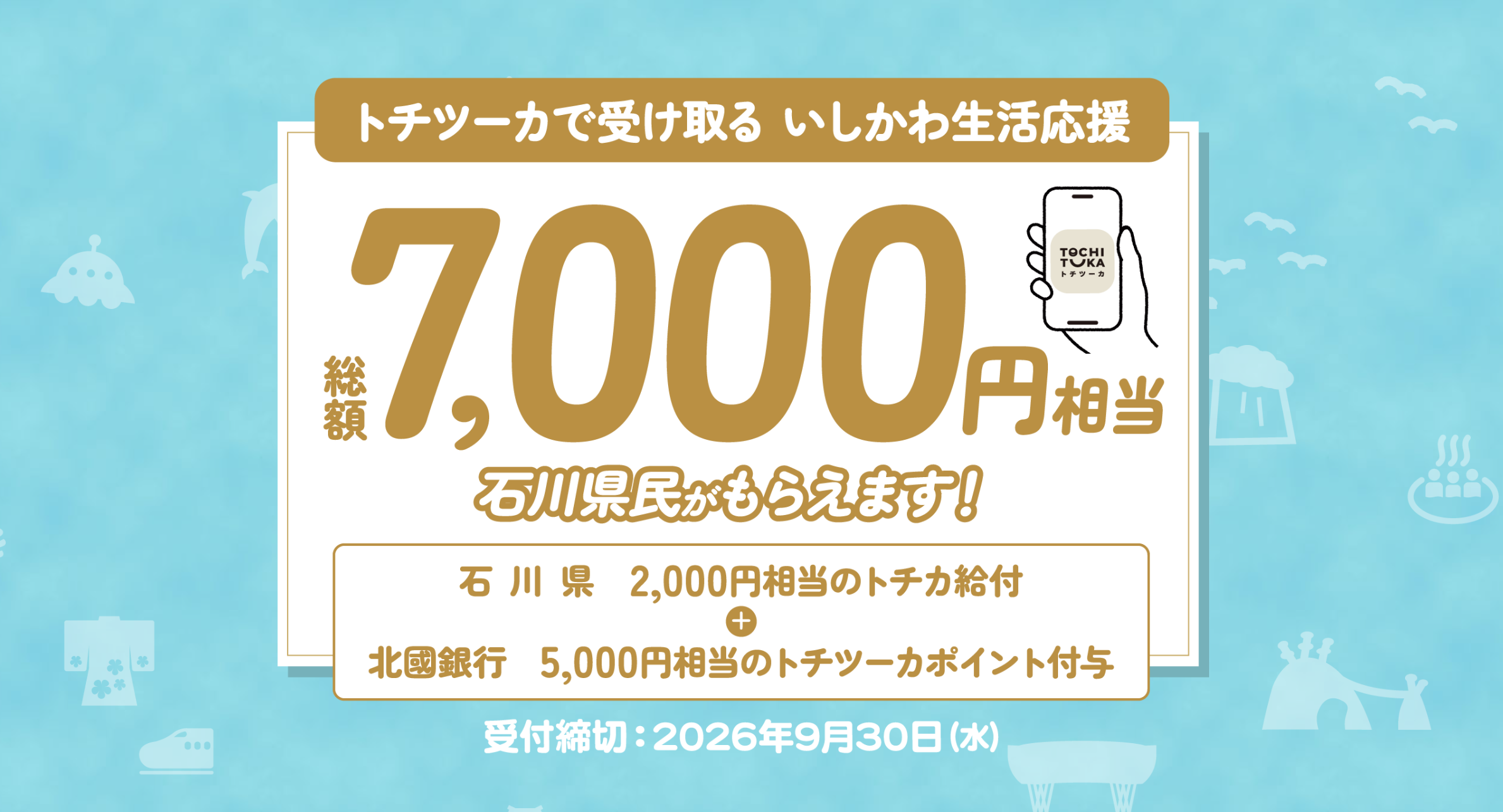 本取組みでは、物価高騰の影響を受ける県民の暮らしを支援するとともに、地域のキャッシュレス化と地元消費の促進を図ることを目的として、原則15歳以上の石川県民を対象に、石川県からの2,000円相当のトチカ(石川県物価高騰対策事業)と、北國銀行からの5,000円相当のトチツーカポイントの、合計7,000円相当を給付いたします。