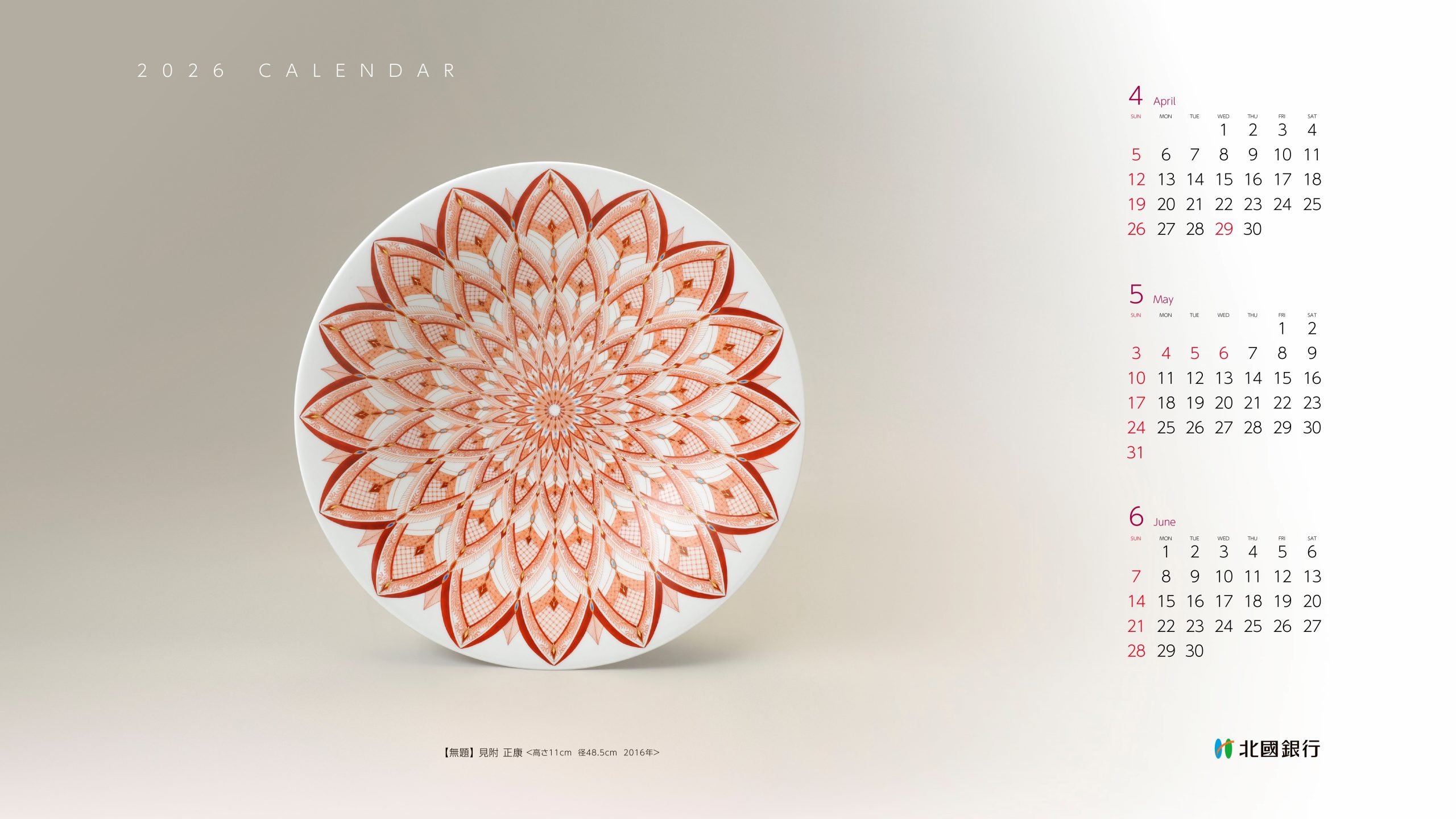 春版(4月~6月)は、石川県の九谷焼作家である見附 正康氏の作品を掲載いたします。電子版カレンダーは、北國銀行のホームページよりどなたでもダウンロード可能となっております。パソコンやタブレット端末・スマートフォンの待受画像としてもご利用いただけます。