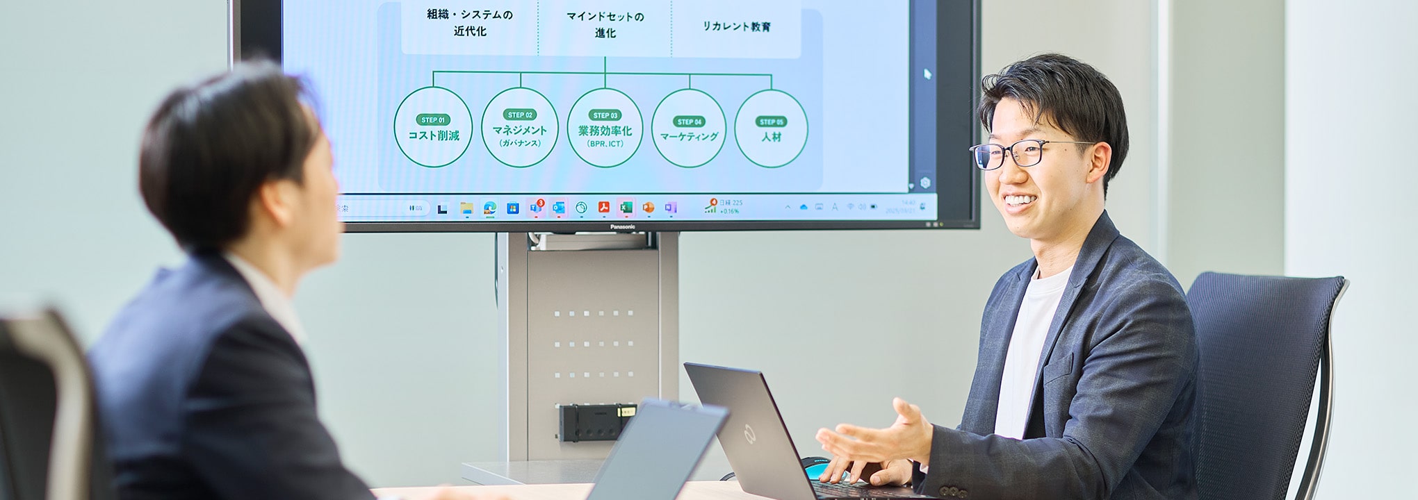 経営戦略グループは、経営目線でお客さまと対話しながら会社の方針を決定していきます。お客さまの経営改善や成長に直接携わることができる特徴があります。このプロセスを通じて、お客さまと深い信頼関係を築くことができる点も大きな魅力です。