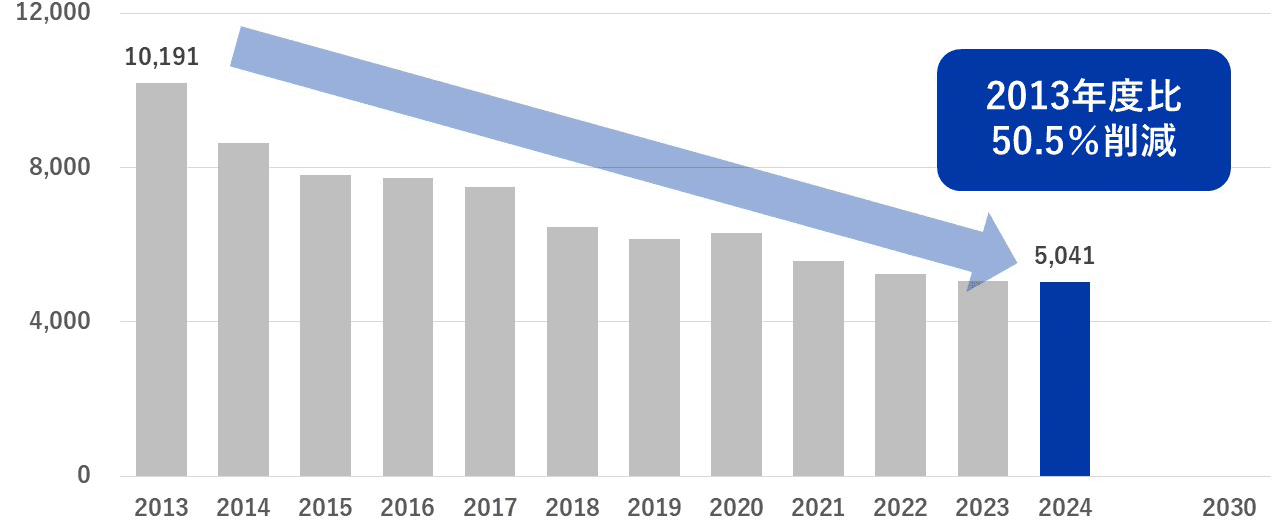 当社は、GHG排出量としてScope1.2についての実績を開示しており、気候変動の指標は「CO₂排出量削減の実績」としています。またCO₂排出量削減目標として、2030年度の排出量を2013年度比▲100%として定めております。